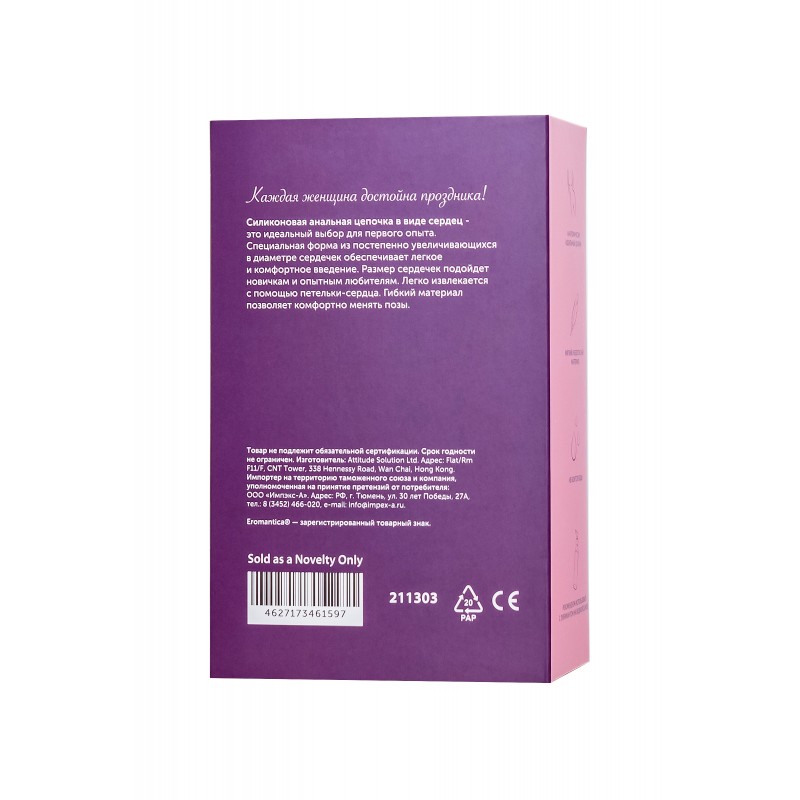 Специальная форма из постепенно увеличивающихся в диаметре сердечек обеспечивает легкое и комфортное введение. Размер сердечек подойдет новичкам и опытным любителям. Легко извлекается с помощью петельки-сердца. Гибкий материал позволяет комфортно менять позы во время секса.