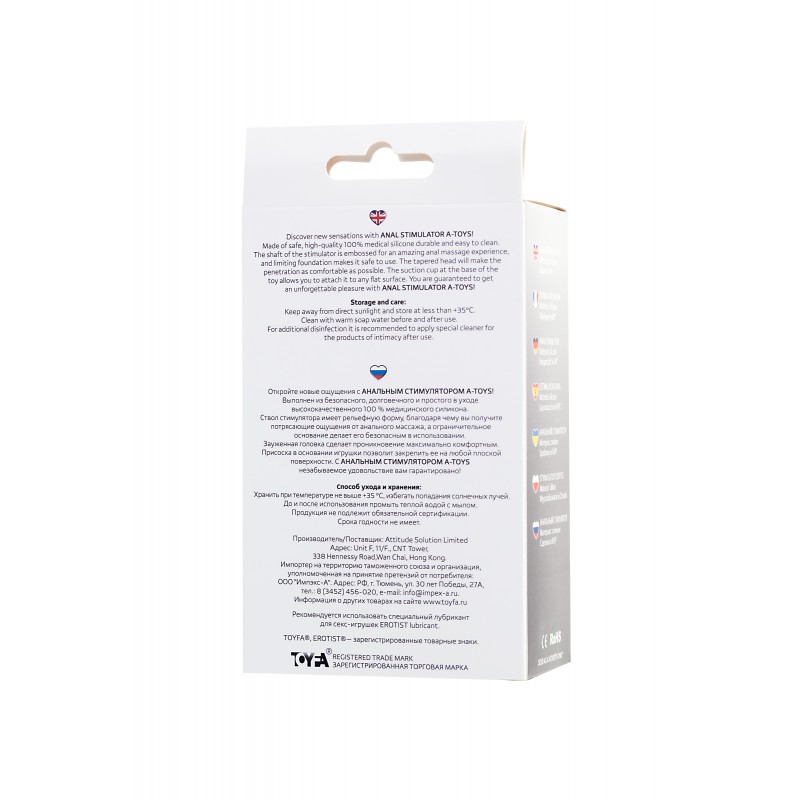 Откройте новые ощущения с анальным стимулятором A-Toys SPIKN! Она выполнена из безопасного, долговечного и простого в уходе высококачественного 100 % медицинского силикона. Ствол стимулятора имеет рельефную форму, благодаря чему вы получите потрясающие ощущения от анального массажа, а ограничительное основание делает ее безопасной в использовании. Зауженная головка сделает проникновение максимально комфортным. Присоска в основании игрушки позволит закрепить ее на любой плоской поверхности. С анальным стимулятором A-Toys незабываемое удовольствие вам гарантировано! Общая длина – 14 см. Рабочая длина – 11,5 см. Макс. диаметр – 3,1 см.