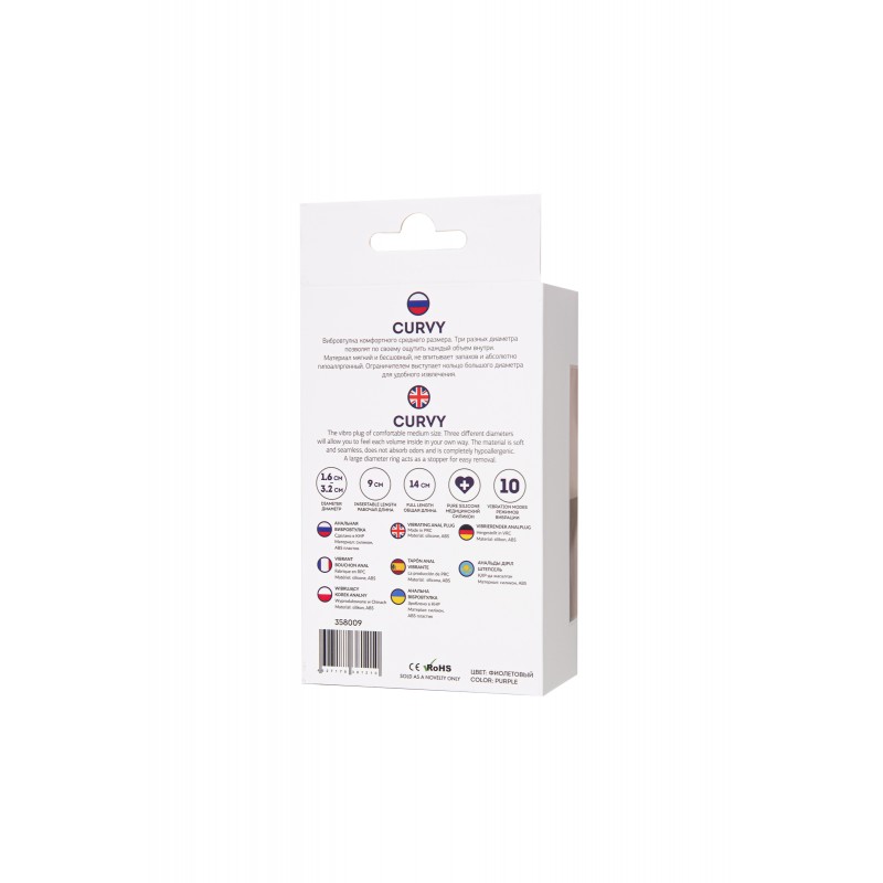 Curvy Вибровтулка комфортного среднего размера. Три разных диаметра позволит по своему ощутить каждый объем внутри. Материал мягкий и бесшовный, не впитывает запахов и абсолютно гипоаллргенный. Ограничителем выступает кольцо большого диаметра для удобного извлечения. 10 режимов вибрации, съёмная вибропуля.