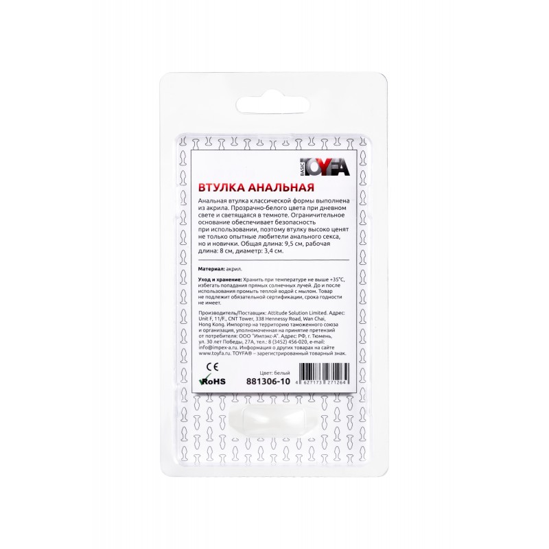 Анальная втулка TOYFA, акрил, белый, 9,5 см, Ø 3,4 см код 881306-10