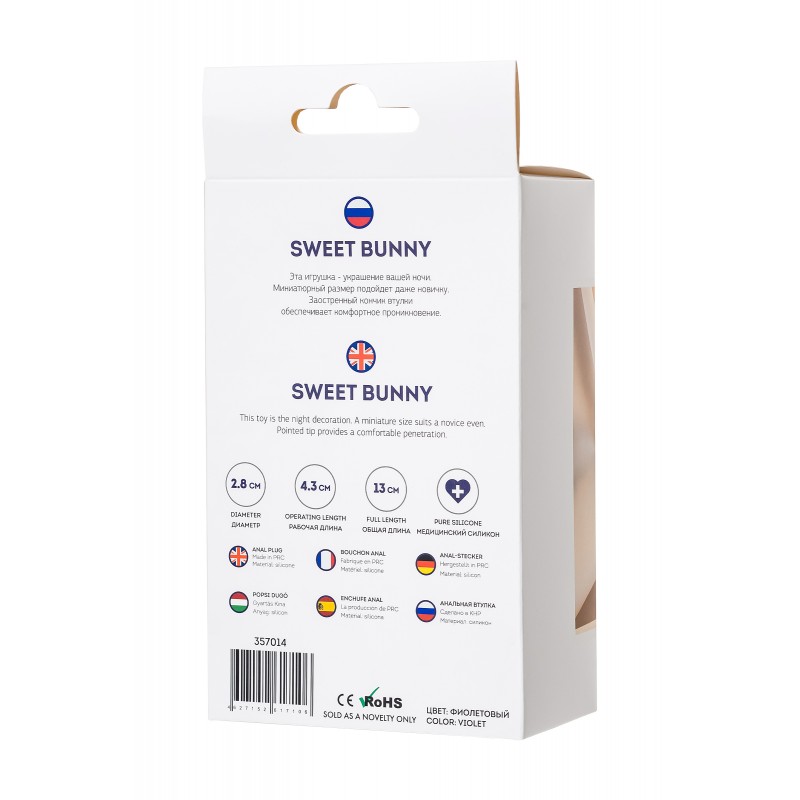 Sweet bunny Эта игрушка — украшение вашей ночи и повод для игры. Миниатюрный размер подойдет даже новичку. Заостренный кончик анальной пробки обеспечивает комфортное проникновение.