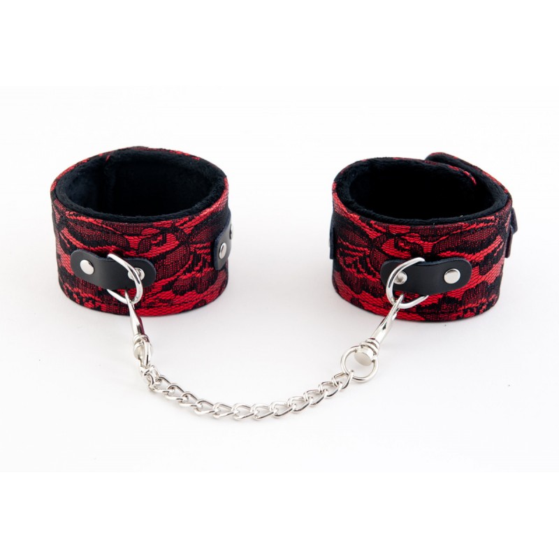 Поножи мягкие, красного цвета с кружевным черным рисунком, внутри подшиты меховой подкладкой. Подкладка не даст оковам натереть вашу кожу, что сделает применение комфортным.