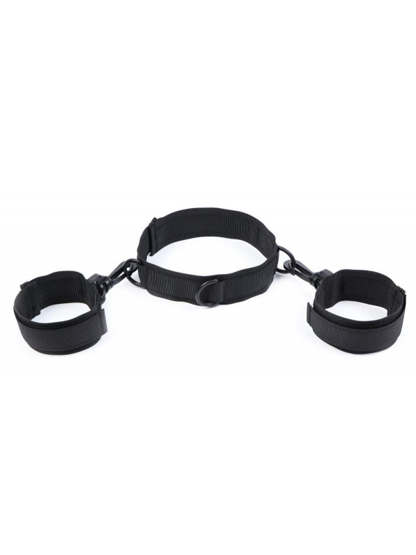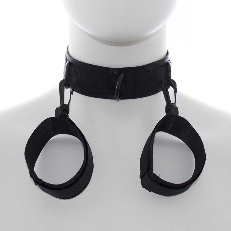 С помощью фиксатора рук к шее Вы не оставите шанса Вашему рабу вырваться из оков!Выполненный из черного нейлона аксессуар надежно фиксируется на шее и запястьях с помощью липучки. Фиксатор не натирает нежную кожу и комфортно ощущается на теле. С помощью пластиковых карабинов наручники крепятся к ошейнику. Также Вы можете использовать фиксаторы и по отдельности!Размер: универсальный, регулируемый