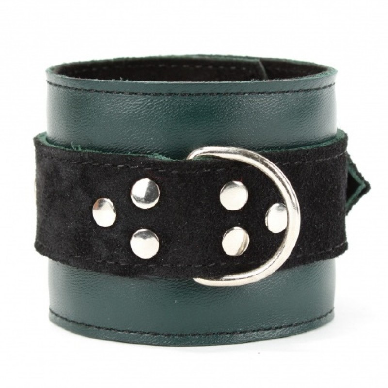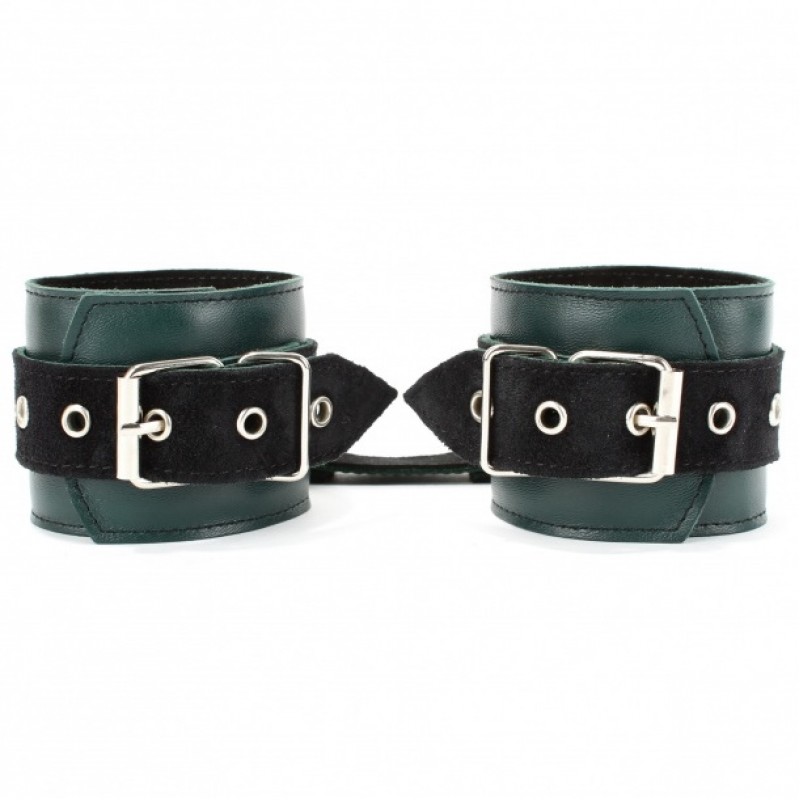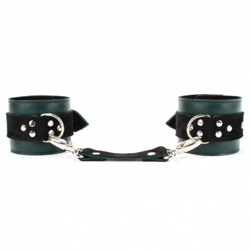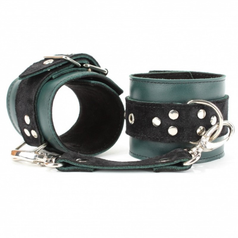 Оковы выполнены из натуральной кожи изумрудного цвета.Изделие декорировано ремнями из замши черного цвета. Посредине аксессуара расположено полукольцо из сварной фурнитуры. Оковы надежно фиксируются пряжками и ремнями, позволяющими выбрать нужный размер, кожаное соединение на карабинах фиксирует оковы вместе. Стильный аксессуар отлично подходят для воплощения эротических БДСМ игр.