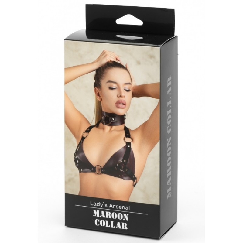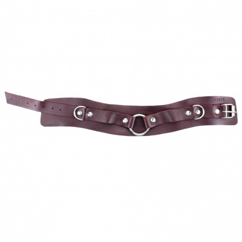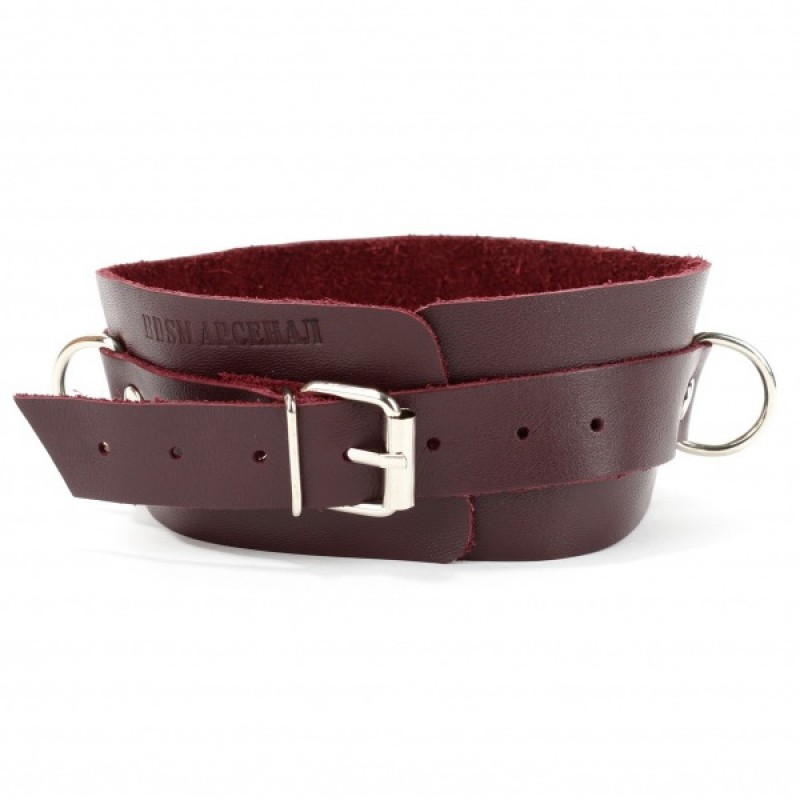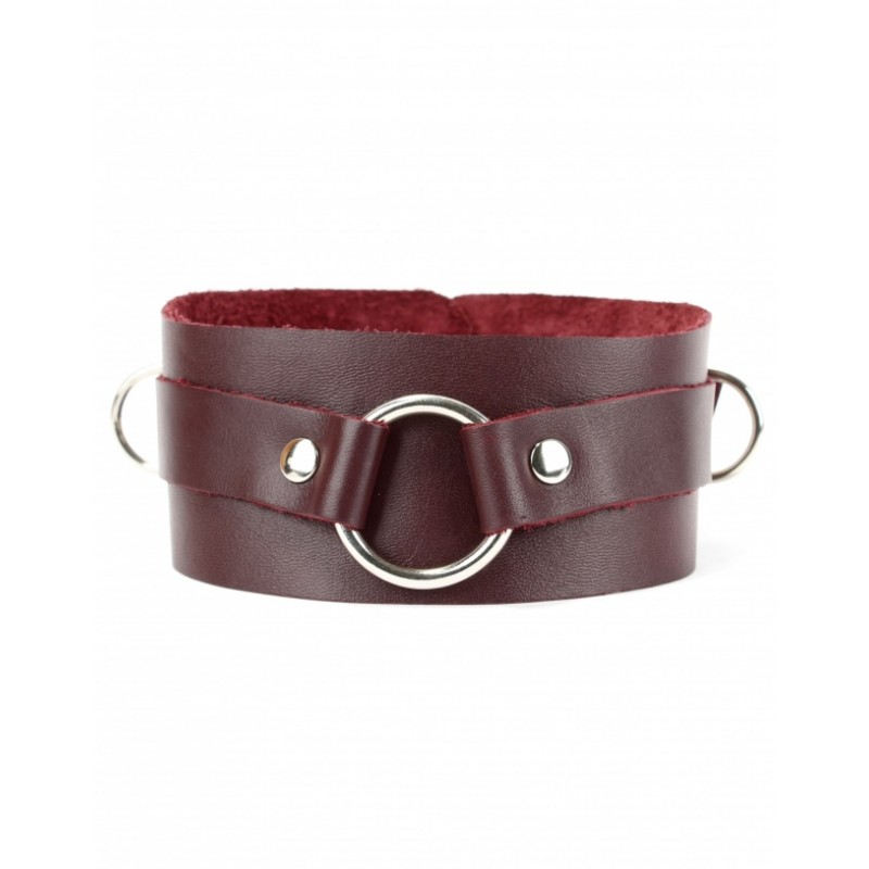 Ошейник выполнен из натуральной кожи бордового цвета, декорирован вставкой из черной замши, заклепками, металлическим кольцом и двумя полукольцами.Товар для любителей "особой романтики", наполнит любой ваш вечер страстью, гармонией и романтикой.Сзади аксессуар надежно фиксируется пряжкой, ремень позволяет выбрать нужный размер. Мягкий подклад из замши обеспечит комфортное пребывание в аксессуаре.