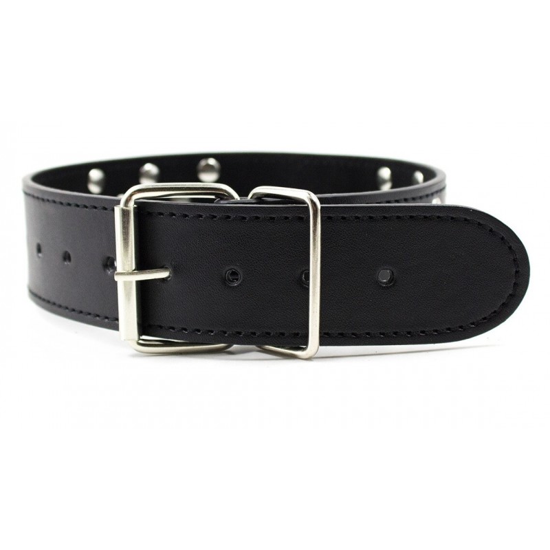 Такой ошейник еще и украсит шею его обладателя, он выполнен из черной искусственной кожи и по всей длине украшен серебристыми