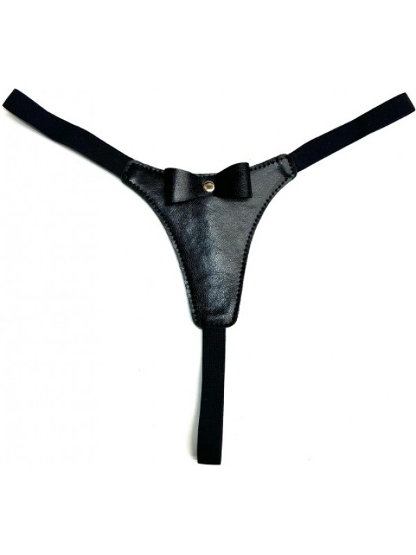 Сексуальные стринги черного цвета из экокожи декорированные бантиком код BA50005