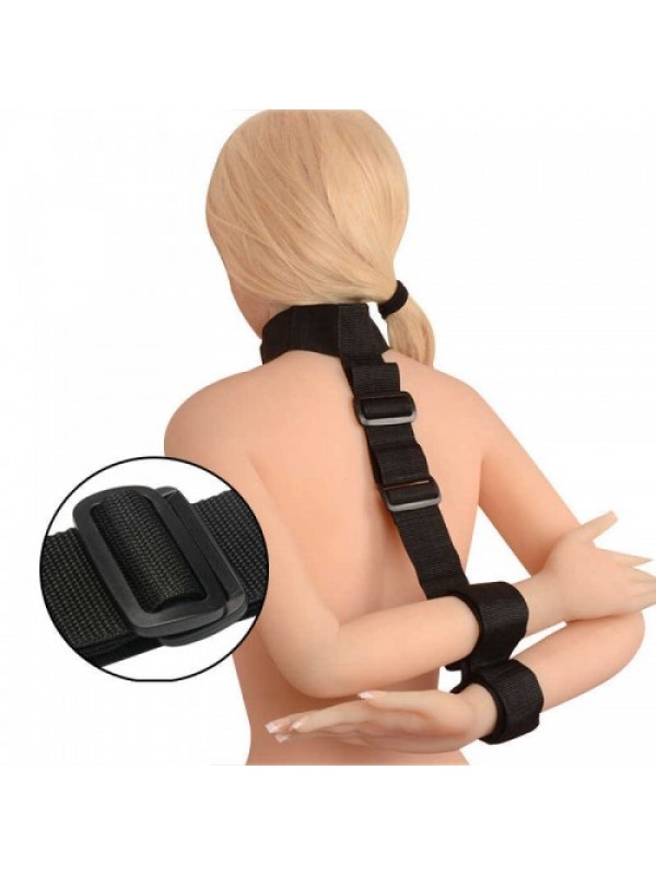От ошейника по спине идет длинный регулируемый ремень с наручниками.
