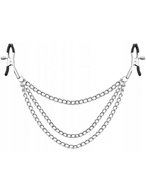 Вкладыши зажимов изготовлены из мягкой резины, прикосновение которой уже само по себе приятно, а давление зажимов регулируется посредством специальных винтов.Они просто обязаны быть в Вашей интимной коллекции! Размеры цепей: первая цепь - 21 см, вторая цепь - 22,5 см, третья цепь - 23,5 см.