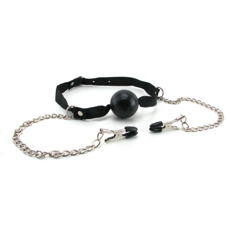 Набор двойного действия «Fetish», который представляет собой кляп с зажимами на соски!Набор состоит из кляпа в виде шарика черного цвета (диаметр – 4,7 см) и зажимов для сосков. Кляп черный на тканевом ремешке, не дышащий – заставит Вашу жертву молчать! Размер ремешка регулируется. По бокам на двух кольцах две металлические цепочки с зажимами на соски. Зажимы сделают Вашу грудь намного аппетитнее, а про ощущения полученные Вами нам и не стоит рассказывать. Давление зажимов не регулируется, на кончиках силиконовые накладки для комфортного использования.В подарок черная атласная маска на глаза!Материал: ПВХ