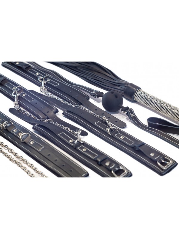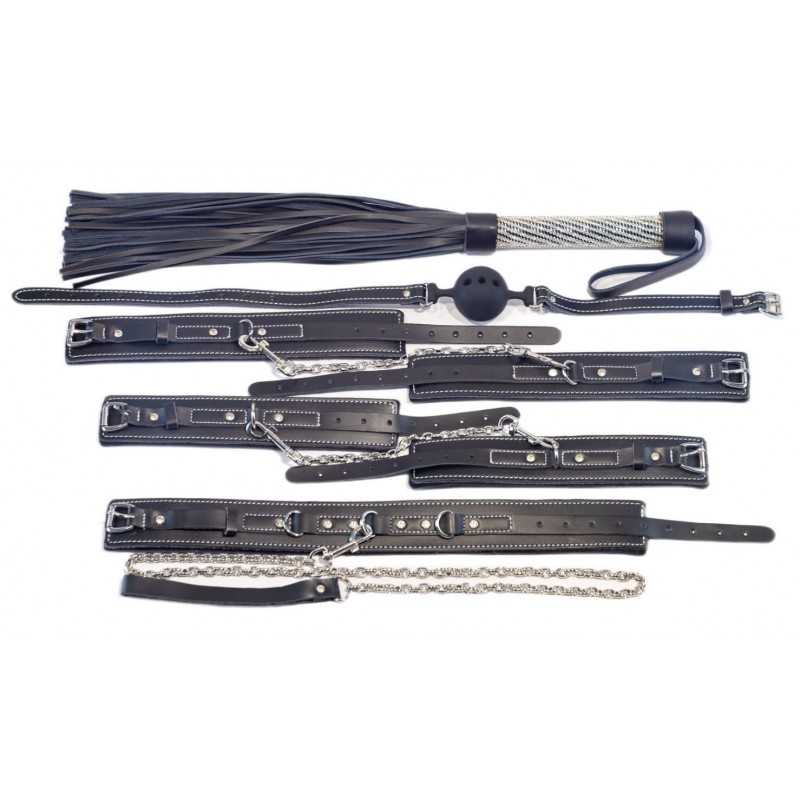 Только вообразите, как сексуален вид обнаженного тела Вашего партнера, когда на нем лишь ошейник с поводком... и Ваш раб готов на все ради своего господина... Очень возбуждает!В набор входят: наручники, поножи, плеть, кляп, ошейник и поводок.Размеры: плеть: общая длина 51 см; кляп: диаметр шарика 4 см, максимальный обхват 58 см; наручники: ширина 4 см, обхват регулируется от 16,5 см до 28,5 см; поножи: ширина 4 см, обхват регулируется от 21 см до 35 см; ошейник: ширина 4 см, по обхвату регулируется от 31 до 47 см, поводок: общая длина 102 см