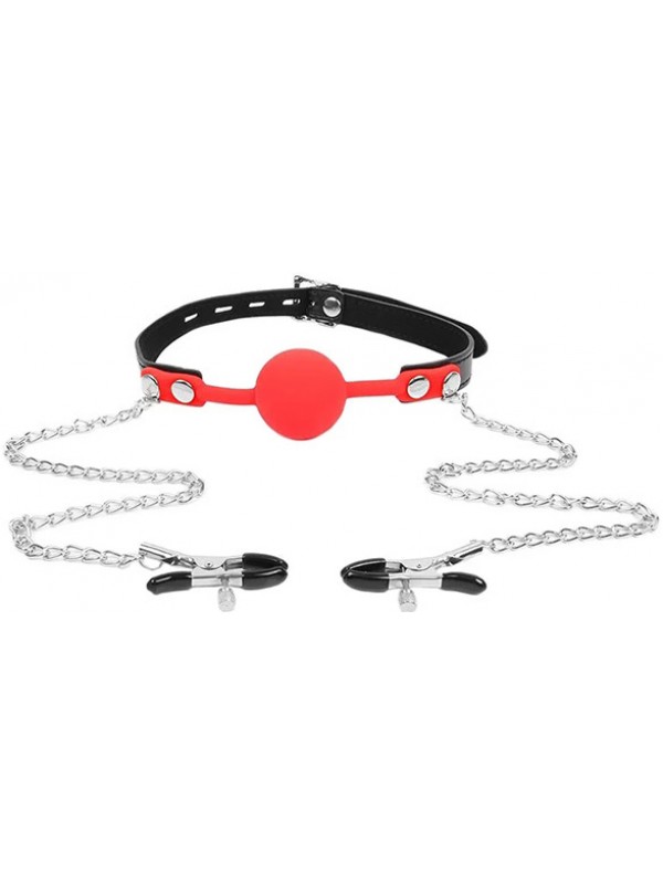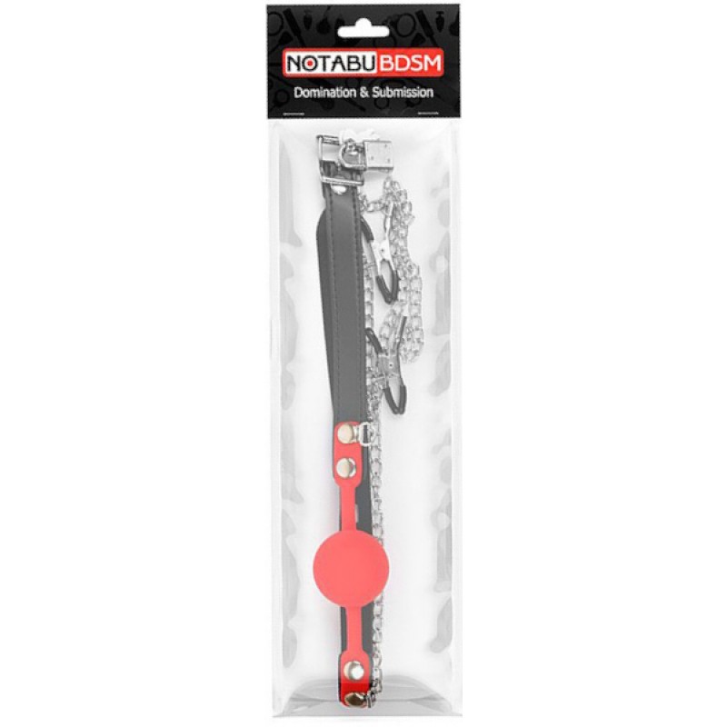 Красный кляп с зажимами для сосков и замочком Notabu код NTB-80541