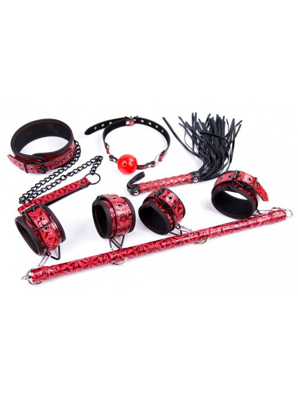 В набор входят: наручники, поножи, распорка, плеть, кляп и ошейник с поводком.Размеры: