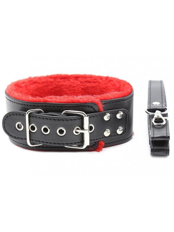 Чёрный ошейник с красным искусственным мехом и поводком код 263202034