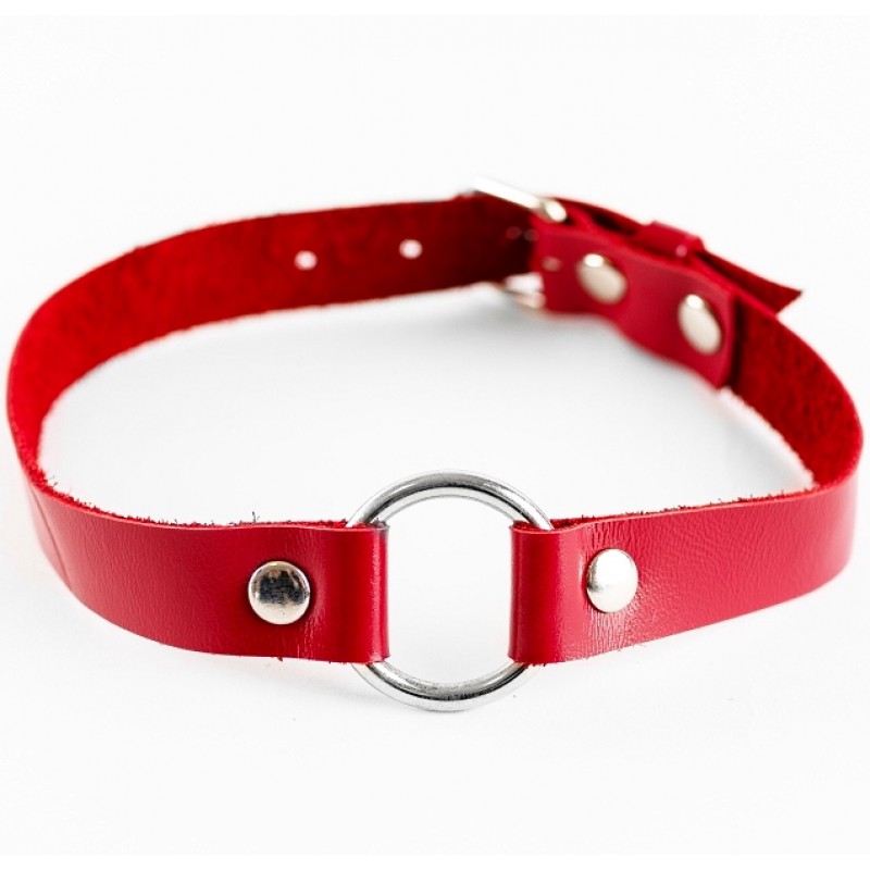 Элегантный чокер из натуральной кожи красного цвета, декорированный металлическим кольцом диаметром 3 см.Многофункциональный аксессуар, который, при желании, может использоваться и как ошейник, и как кляп. Сзади аксессуар надежно фиксируется пряжкой, ремень позволяет выбрать нужный размер.