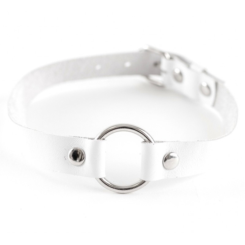Элегантный чокер из натуральной кожи белого цвета, декорированный металлическим кольцом диаметром 3 см.Многофункциональный аксессуар, который, при желании, может использоваться и как ошейник, и как кляп. Сзади аксессуар надежно фиксируется пряжкой, ремень позволяет выбрать нужный размер. Нежная натуральная кожа очень комфортна в использовании.
