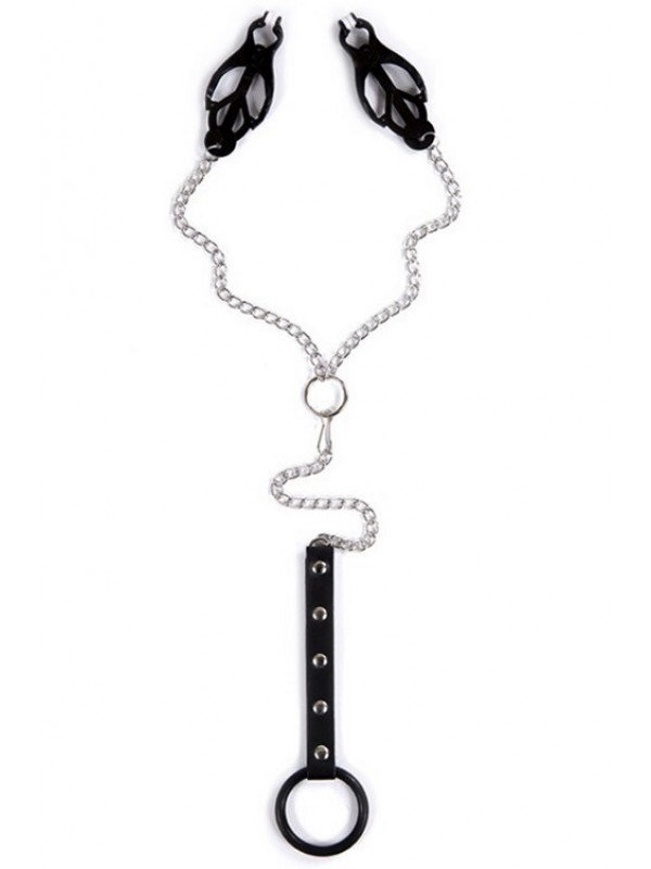 Вы доставите невероятное удовольствие себе и своему партнеру, используя во время игр такой необычный аксессуар для мужчин!Зажимы для сосков обладают удивительной возбуждающей силой, а когда они еще соединены металлической цепью с пенисом, который зажат в силиконовом кольце, то возбуждение усиливается многократно!Силиконовое колечко выполняет функцию эрекционного кольца - для уверенной эрекции Вам нужно надеть его на основание полового члена для того, чтобы ограничить кровоток, тем самым Вы увеличите длительность эрекции и добавите объем пенису.Размеры: длина цепочки с зажимами 47 см, максимальная длина кожаного ремешка 12,5 см; внутренний диаметр кольца для пениса 3,6 см