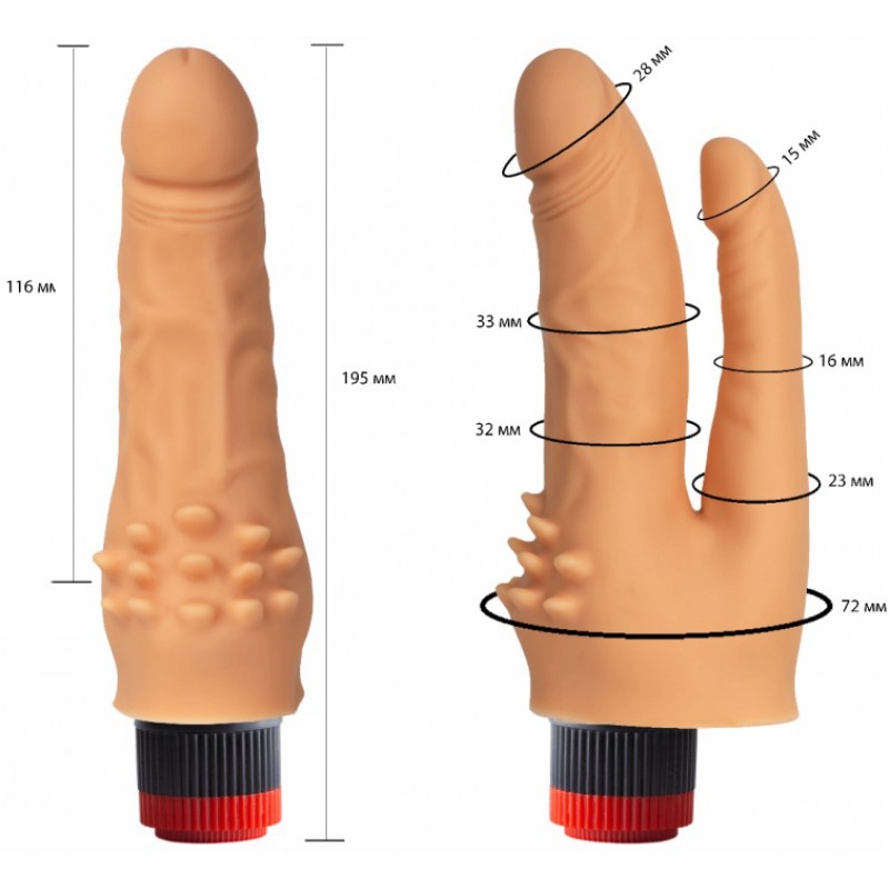 интим-изделий и подарит в два раза больше удовольствия! Для более комфортного использования и сохранения качества материала рекомендуем использовать смазки только на водной основе.Размеры: общая длина 19,5 см, рабочая длина 11,6 см, диаметр вагинального отростка 2,8-3,2 см, диаметр анального отростка 1,5-2,3 см