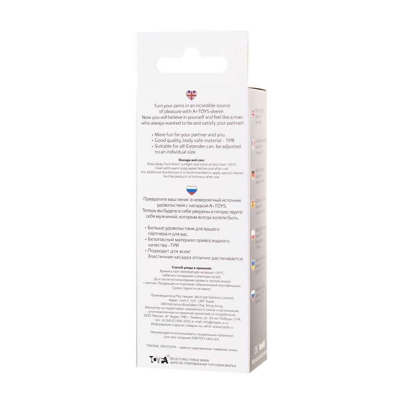 Превратите ваш пенис в невероятный источник удовольствия с насадками A-Toys. Теперь вы будете в себе уверены и почувствуете себя мужчиной, которым всегда хотели быть и удовлетворить своего партнера! • Гарантированное и мгновенное увеличение пениса без операций и таблеток! • Больше удовольствия для вашего партнера и для вас. • Превосходный, безопасный материал –TPR. •Подходит для всех! Эластичная насадка отлично растягивается.