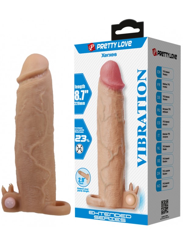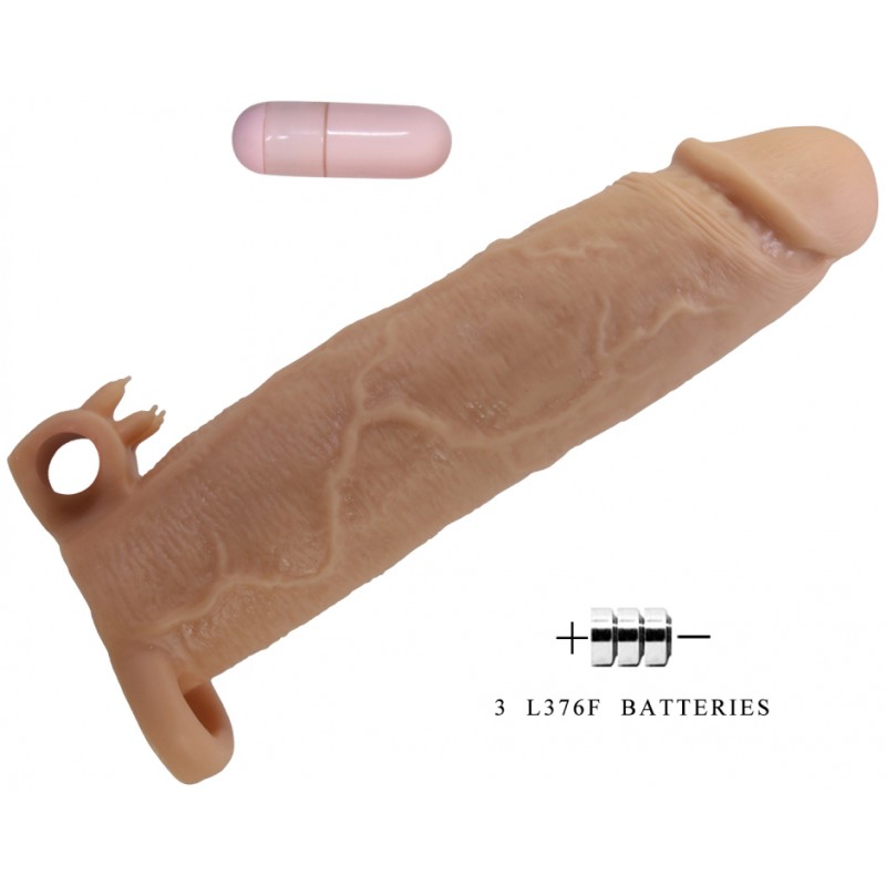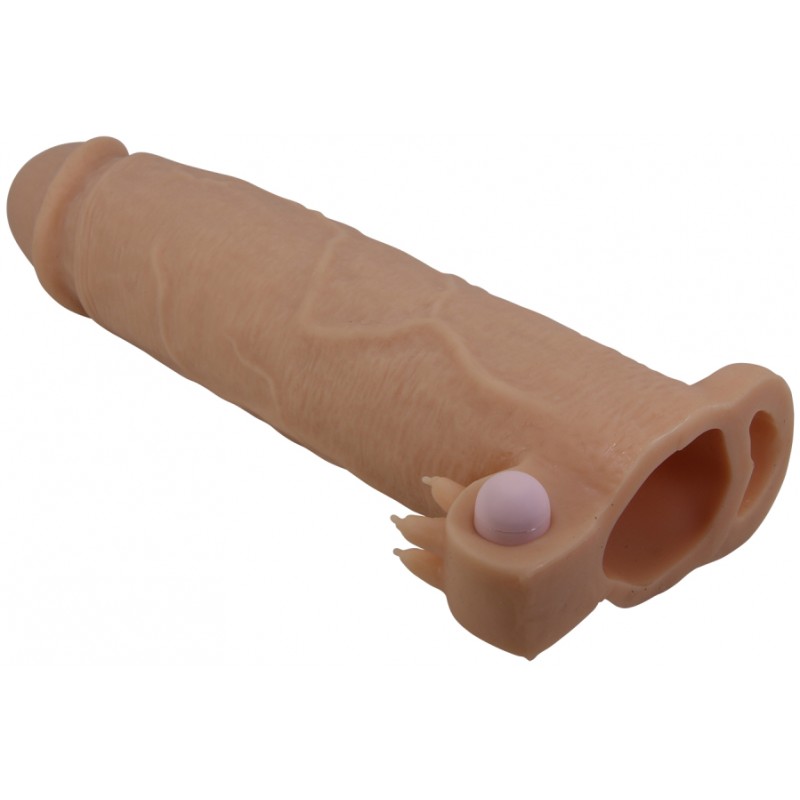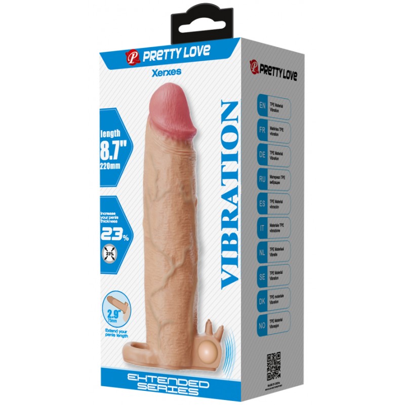 Увеличивающая насадка на пенис Pretty Love Xerxes c клиторальным стимулятором и петлей под мошонку – потрясающая находка для любителей оригинальных секс-игрушек!Вибронасадка на пенис увеличивает длину и усиливает ощущения во время секса: подходит для улучшения эрекции, продления акта и максимального удовольствия обоих партнеров.Насадка имеет четко очерченную головку и выпуклые венки, которые оказывают дополнительное массажное воздействие на стенки влагалища.Особенность насадки – наличие встроенной вибропули и клиторального стимулятора с небольшими массажными усиками. Вибропуля стимулирует клитор партнерши, усиливая оргазмы, а встроенный удлинитель добавляет длину для более глубокого проникновения. Такая конструкция позволит доставить партнерше еще больше удовольствия во время постельных игр. Насадка выполнена из гладкого TPR и фиксируется под мошонку кольцом для надежной посадки.Для более комфортного использования и сохранения качества материала рекомендуем использовать смазки только на водной основе.