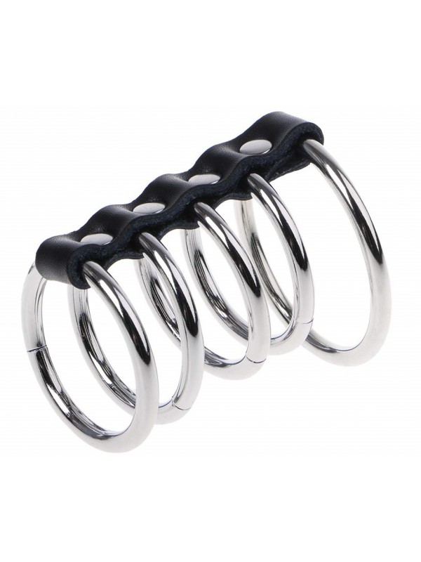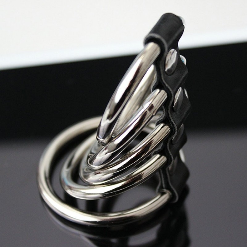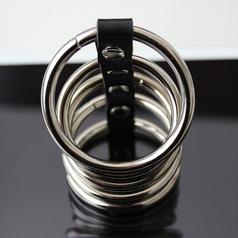 Наибольшее кольцо фиксирует мошонку и основание пениса, четыре кольца поменьше надеваются на ствол пениса.Кольца скреплены ремешком из натуральной кожи с металлическими клепками.