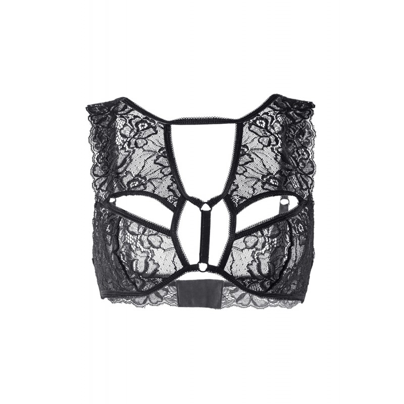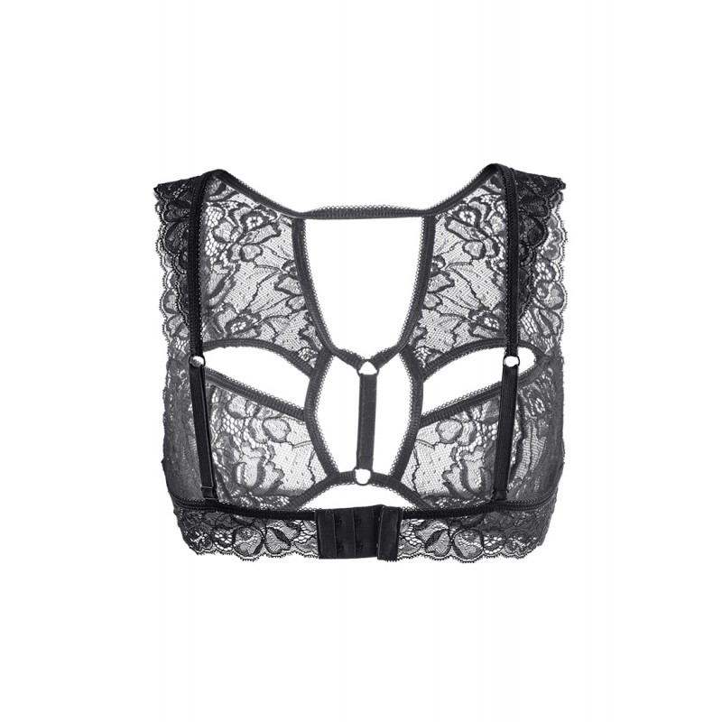 Мягкий кружевной топ Erolanta® Marisa с декоративными вырезами, стрепами и перемычками. Свободный ажурный край. Регулируемые бретели. Многорядная застежка на спине. *Допускается замена кружева на аналогичное. На видео бралетт Erolanta® Marisa дополнен идеально сочетающимся трусиками Erolanta® Julia.