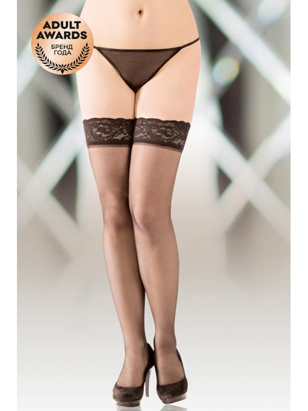Ажурная, с цветочным орнаментом черная резинка с силиконом составляет корону гладких чулок.