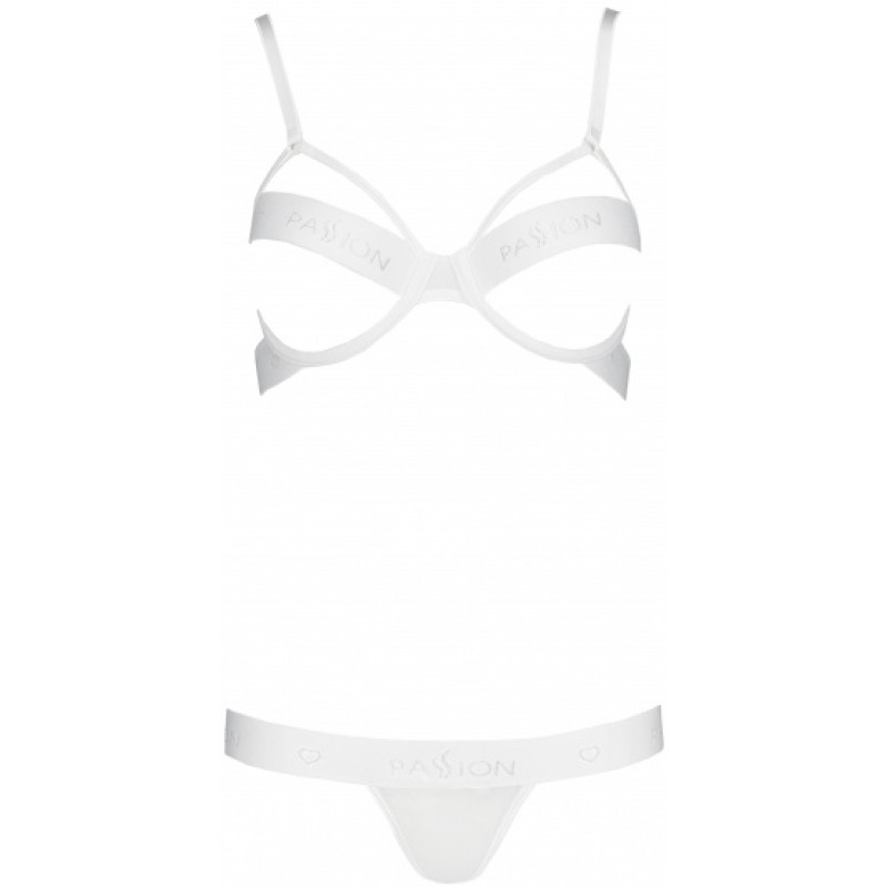Белый комплект нижнего белья Kyouka выполнен из полупрозрачной сеточки и эластичных стрэп-лент с фирменным логотипом! Открытый лиф на косточках, на спинке застежка на крючки-петли.