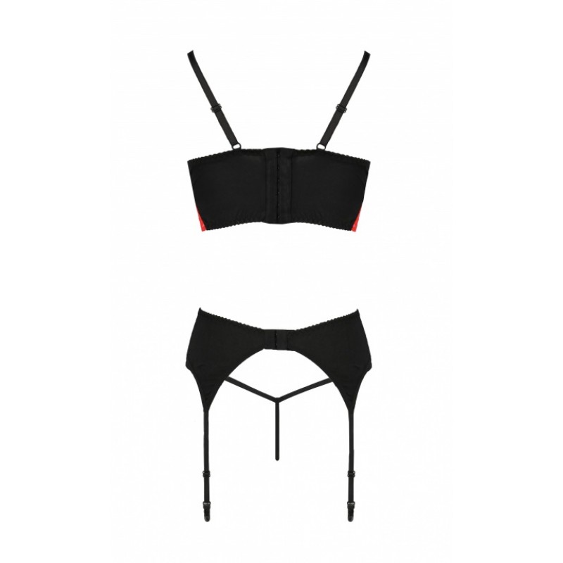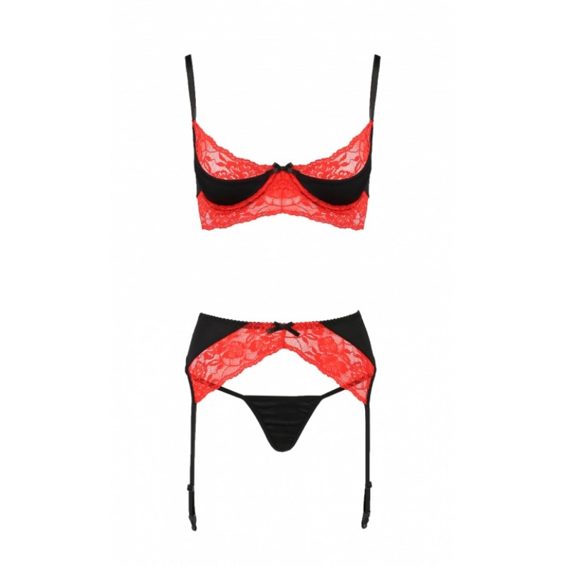 Эффектный комплект белья Odina выполнен из черной эластичной ткани и кружева красного цвета!В комплект входит бюст-топ с мягкой чашкой на косточках, пояс для чулок и стринги.