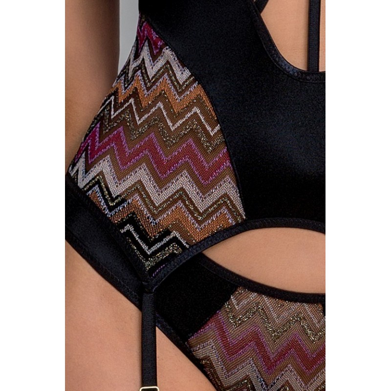 Корсет выполнен из глянцевого эластичного сатина. Красивые кружевные детали придают деликатный и особенный характер. Грудь украшает шикарный узор и кокетливый прозрачный материал. Для чулочков предусмотрены специальные подтяжки. Трусики-бикини гармонично вписываются в комплект кружевными вставками в тон корсета. Белье упаковано в красивую глянцевую упаковку с фотографией модели - отличный вариант для подарка.