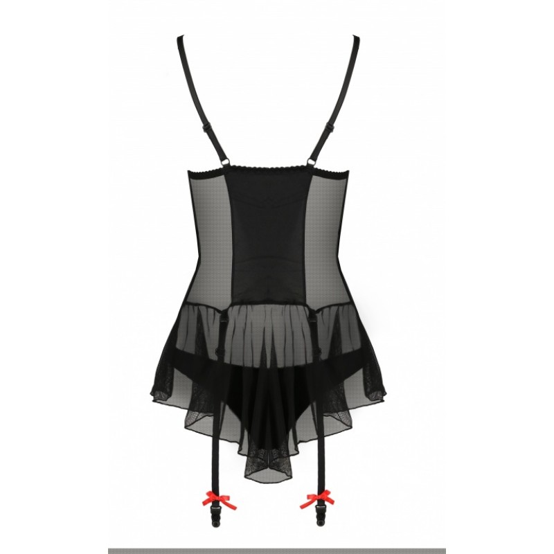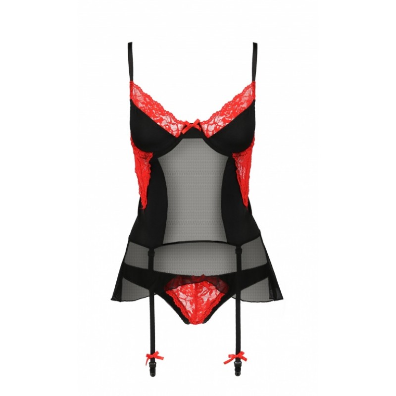Очаровательный корсет Odina черного цвета с подвязками для чулок, выполнен из эластичной ткани, полупрозрачного тюля и кружева красного цвета!Лиф мягкий на косточках. Бретели и подвязки регулируются по длине.
