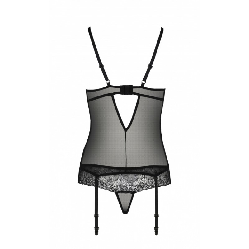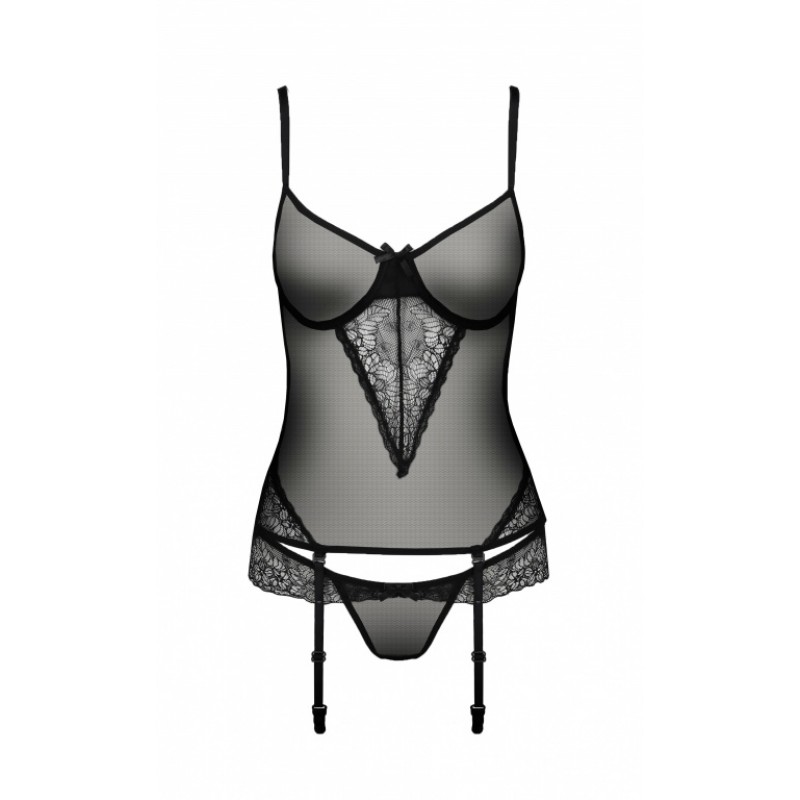 Эротический полупрозрачный корсет с подвязками для чулок и трусики черного цвета! Корсет с подвязками для чулок, на спине застежка, бретели регулируются. Чулки в комплект не входят.