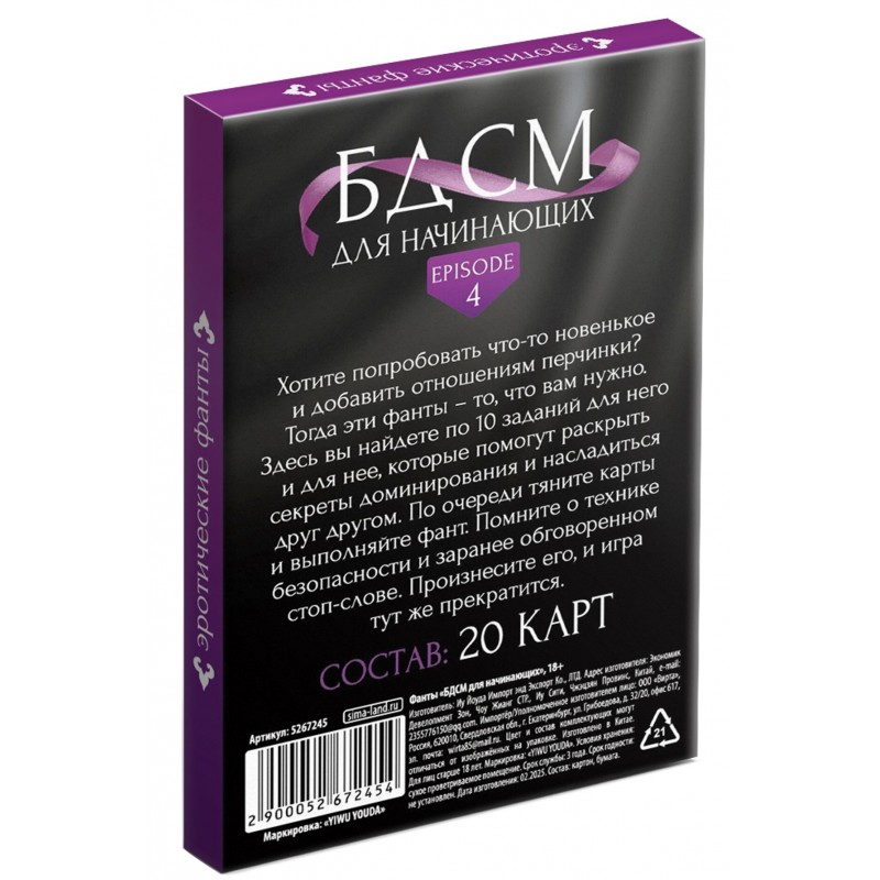 Помните о технике безопасности и заранее обговорённом стоп-слове! Произнесите его, и игра тут же прекратится.Внутри вы найдёте 20 карточек.Упаковка: коробка