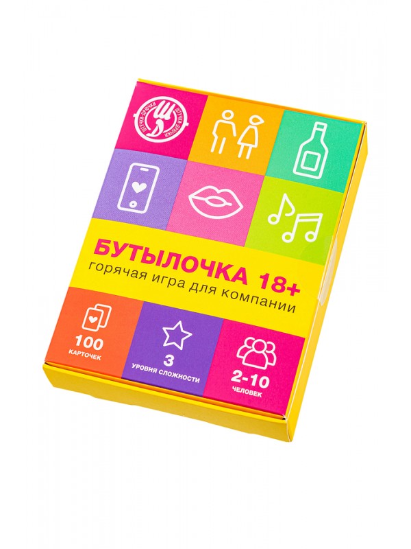 «Бутылочка 18+» — горячая игра для весёлой компании! Прокачай вечеринку до максимума! Вращай бутылочку, тяни карточку и выполняй одно из 100 заданий — от милых до провокационно-откровенных. Что внутри: 100 карточек: ▪ 35 личных заданий (зелёные) ▪ 35 эротических (оранжевые) ▪ 30 откровенных (розовые) Наклейка на бутылку Яркая коробка Весело, флиртово, местами пикантно — идеально для близких друзей или смелых незнакомцев. 2–10 игроков ⭐ 3 уровня сложности ⏱ Подойдёт как для старта вечеринки, так и для её кульминации.