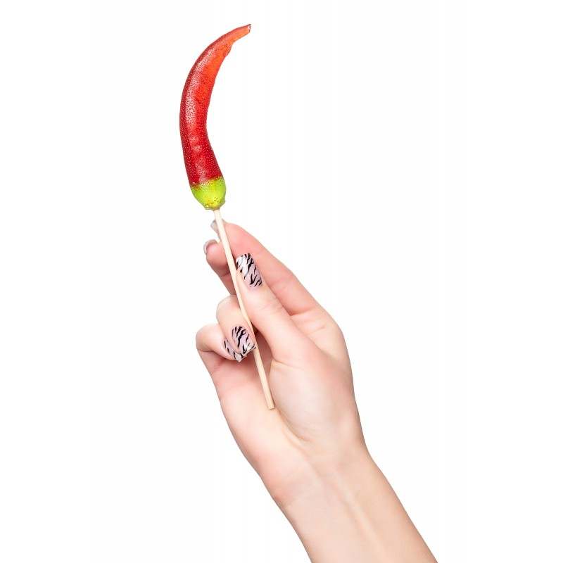 Яркая и вкусная леденцовая карамель на палочке в форме перчика станет приятным дополнением подарка на любой из праздников!