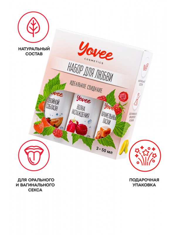 "Набор для любви" от бренда Yovee идеально подходит для эротических экспериментов. В одной упаковке три съедобных, увлажняющих геля на водной основе. Первый обладает сочным вкусом и ароматом малины, второй - клубничной нежностью с волнующими нотами дыни, третий - соблазнительной карамели. Используйте самостоятельно или создайте свой вкус, смешивая их! Несмотря на сладость, гели не содержат сахара в составе, не нарушают микрофлору и pH-баланс. Подходят как для вагинального, так и для орального секса. Совместимы со всеми видами презервативов и игрушек для взрослых. ИДЕАЛЬНЫЙ ПОДАРОК ВОЗМОЖНОСТЬ СОЗДАТЬ СВОЙ ВКУС Все гели Yovee имеют простой и безопасный состав: вода; гидроксиэтилцеллюлоза - натуральный компонент растительного происхождения, стабилизатор эмульсий, регулятор вязкости; Д-пантенол защищает слизистые, запускает процесс регенерации тканей; сорбат калия и бензоат натрия – безопасные пищевые консерванты, разрешенные в натуральной и органической косметике; лимонная кислота помогает поддерживать оптимальный уровень рН, является естественным консервантом. БЕЗ ГЛИЦЕРИНА БЕЗ ПАРАБЕНОВ БЕЗ КРАСИТЕЛЕЙ БЕЗ САХАРА Комплектация: 721002 Съедобная гель-смазка Yovee «Волна наслаждения» с Д-Пантенолом, со вкусом малины, 50 мл (Состав: вода, гидроксиэтилцеллюлоза, Д-пантенол, бензоат натрия, сорбат калия, лимонная кислота, пищевой ароматизатор) 721008 Съедобная гель-смазка Yovee «Двойной соблазн» с Д-Пантенолом, со вкусом клубники и дыни, 50 мл (Состав: вода, гидроксиэтилцеллюлоза, Д-пантенол, бензоат натрия, сорбат калия, лимонная кислота, пищевой ароматизатор) 721014 Съедобная гель-смазка Yovee «Карамельные ласки» с Д-Пантенолом, со вкусом «Dulce de Leche», 50 мл (Состав: вода, гидроксиэтилцеллюлоза, Д-пантенол, бензоат натрия, сорбат калия, лимонная кислота, пищевой ароматизатор)