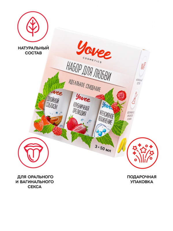"Набор для любви" от бренда Yovee идеально подходит для эротических экспериментов. В одной упаковке три съедобных, увлажняющих геля на водной основе. Первый обладает сочным вкусом и ароматом клубники, второй - соблазнительной клубники с дыней, третий - ухаживающий с гиалуроном. Используйте самостоятельно или создайте свой вкус, смешивая их! Несмотря на сладость, гели не содержат сахара в составе, не нарушают микрофлору и pH-баланс. Подходят как для вагинального, так и для орального секса. Совместимы со всеми видами презервативов и игрушек для взрослых. ИДЕАЛЬНЫЙ ПОДАРОК ВОЗМОЖНОСТЬ СОЗДАТЬ СВОЙ ВКУС Все гели Yovee имеют простой и безопасный состав: вода; гидроксиэтилцеллюлоза - натуральный компонент растительного происхождения, стабилизатор эмульсий, регулятор вязкости; Д-пантенол защищает слизистые, запускает процесс регенерации тканей; сорбат калия и бензоат натрия – безопасные пищевые консерванты, разрешенные в натуральной и органической косметике; лимонная кислота помогает поддерживать оптимальный уровень рН, является естественным консервантом. БЕЗ ГЛИЦЕРИНА БЕЗ ПАРАБЕНОВ БЕЗ КРАСИТЕЛЕЙ БЕЗ САХАРА Комплектация: 721004 Съедобная гель-смазка Yovee «Клубничная прелюдия» с Д-Пантенолом, со вкусом клубники, 50 мл (Состав: вода, гидроксиэтилцеллюлоза, Д-пантенол, бензоат натрия, сорбат калия, лимонная кислота, пищевой ароматизатор) 721008 Съедобная гель-смазка Yovee «Двойной соблазн» с Д-Пантенолом, со вкусом клубники и дыни, 50 мл (Состав: вода, гидроксиэтилцеллюлоза, Д-пантенол, бензоат натрия, сорбат калия, лимонная кислота, пищевой ароматизатор) 721052 Съедобная гель-смазка Yovee «Интенсивное увлажнение» с Д-Пантенолом, гиалуроновая кислота, 50 мл (Состав: вода, гидроксиэтилцеллюлоза, Д-пантенол, бензоат натрия, сорбат калия, гиалуроновая кислота, лимонная кислота)