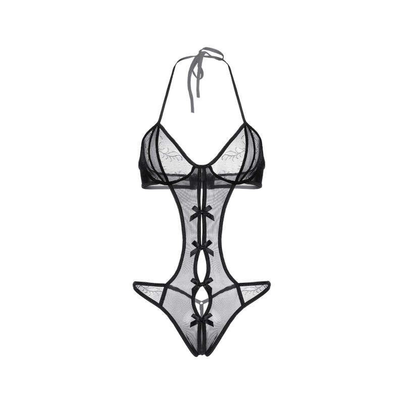 Мягкое боди-монокини из эластичной сетки. Продольный фигурный вырез дополнен сатиновыми бантиками. Завязки на шее, тройная застежка ''крюк-петля'' сзади. Регулируемые боковые перемычки.