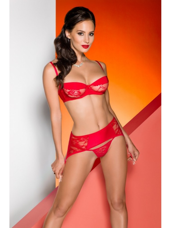 Эротичный красный комплект из эластичного атласного материала со вставками из нежного кружева. В комплект входят трусики-стринги, бюстгальтер с чашечками на косточках и пояс для чулок.