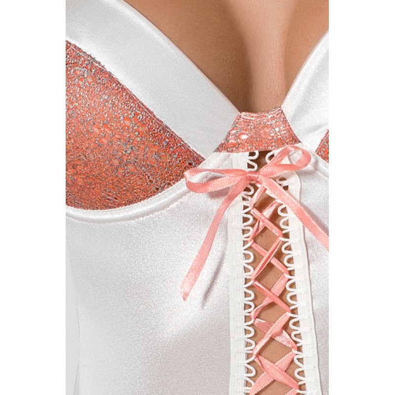 Нежный, романтический, изящный, трепетный корсет Danny!Модель произведена из эластичной молочной ткани с изящным переливом и персиковых сверкающих вставок. Чашка мягкая на удобной косточке создает манящую форму груди, высоту которой помогают менять бретели с регулятором. Оригинальное решение дизайнеров – шнуровка тонкой лентой спереди – привносит в изделие особый шарм.В комплекте идут аккуратные маленькие стринги и регулируемые пажи для чулок.Размер: L/XL