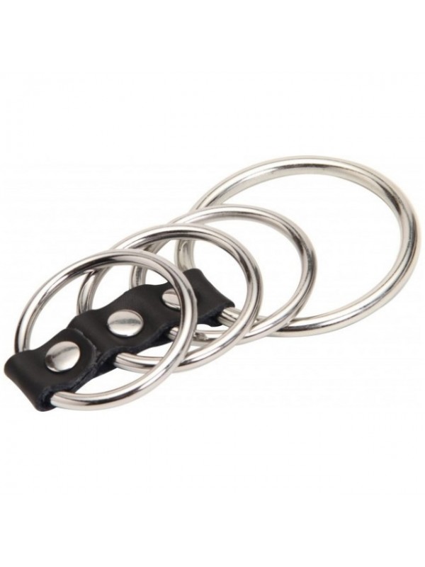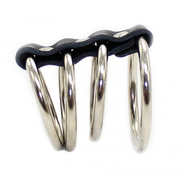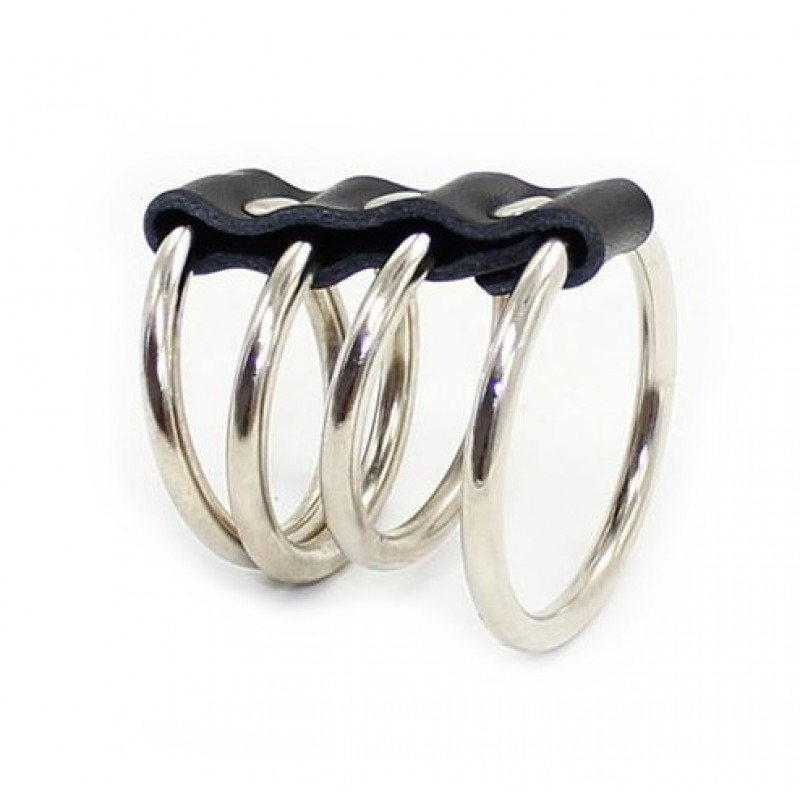 Наибольшее кольцо фиксирует мошонку и основание пениса, а остальные надеваются на ствол пениса.Кольца скреплены ремешком из натуральной кожи с металлическими клепками.
