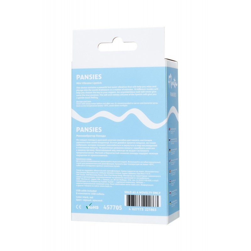 PANSIES Минивибратор Помада Не каждая помада в дамской сумочке способна доставлять настоящее удовольствие своей владелице. В этом девайсе кроется мощная, но тихая вибрация, которая поможет расслабиться и окунуться в мир наслаждений в считанные минуты. 10 различных режимов помогут подобрать ключик к вашему оргазму. Незатейливый вид никогда не выдаст истинного предназначения. Мягкий и бархатистый силикон помады подарит нежные ощущения от прикосновений. Удобная магнитная зарядка, работающая от USB. 10 режимов вибрации Бархатистый силикон Время зарядки 2 часа Время работы на полном заряде 1,5 часа