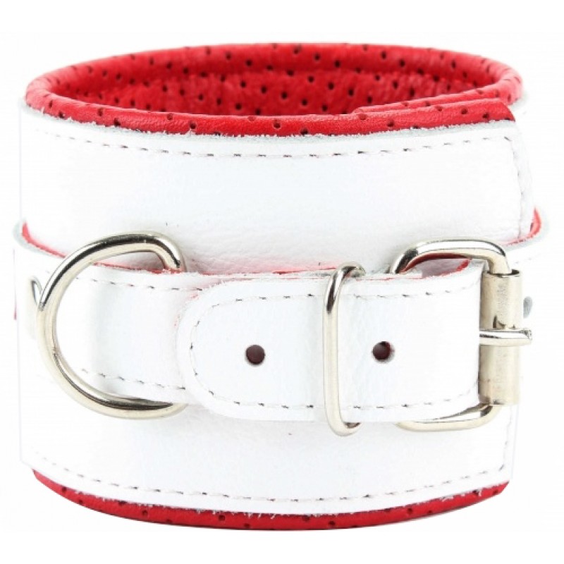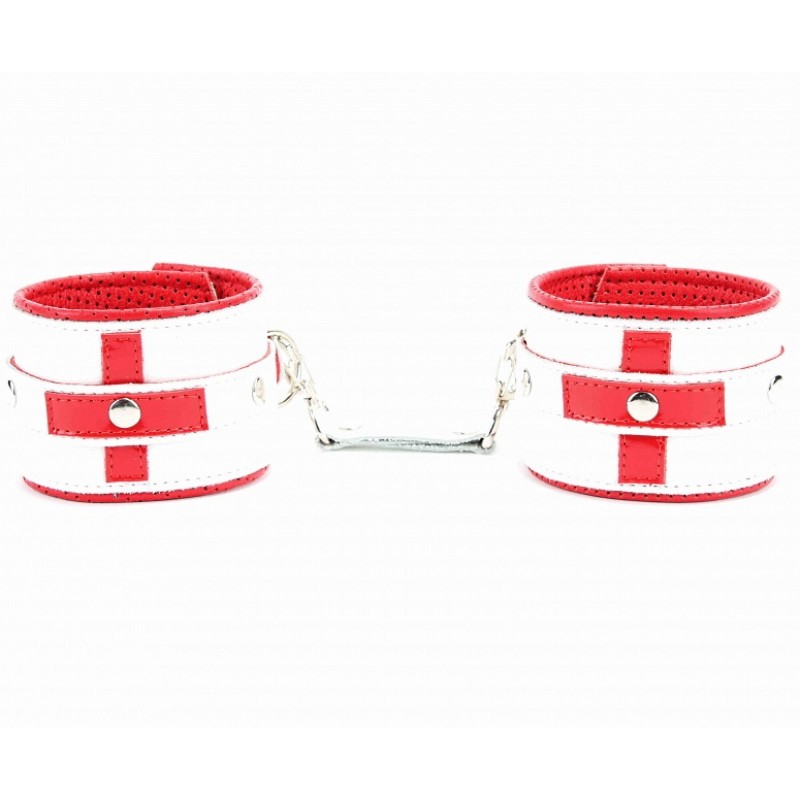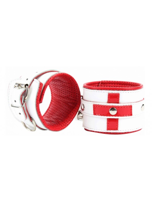 Оковы на ноги из натуральной кожи отлично подойдут для ролевых игр в стиле "Медсестричка"! Выполнены из натуральной гладкой кожи белого цвета с кожаным красным подкладом с перфорацией. Декорированы ярко-красными крестами из лаковой кожи.Поножи надежно фиксируются пряжками и ремнями, позволяющими выбрать нужный размер.Металлическая фурнитура надежно удерживает в подчинении. Кожаное соединение на карабинах фиксирует оковы вместе. Высококачественная кожа очень приятна в использовании. Подклад из нежной перчаточной кожи с перфорацией не будет натирать лодыжки, а также обеспечит комфортное пребывание в образе, помогая полностью погрузиться в БДСМ игру.