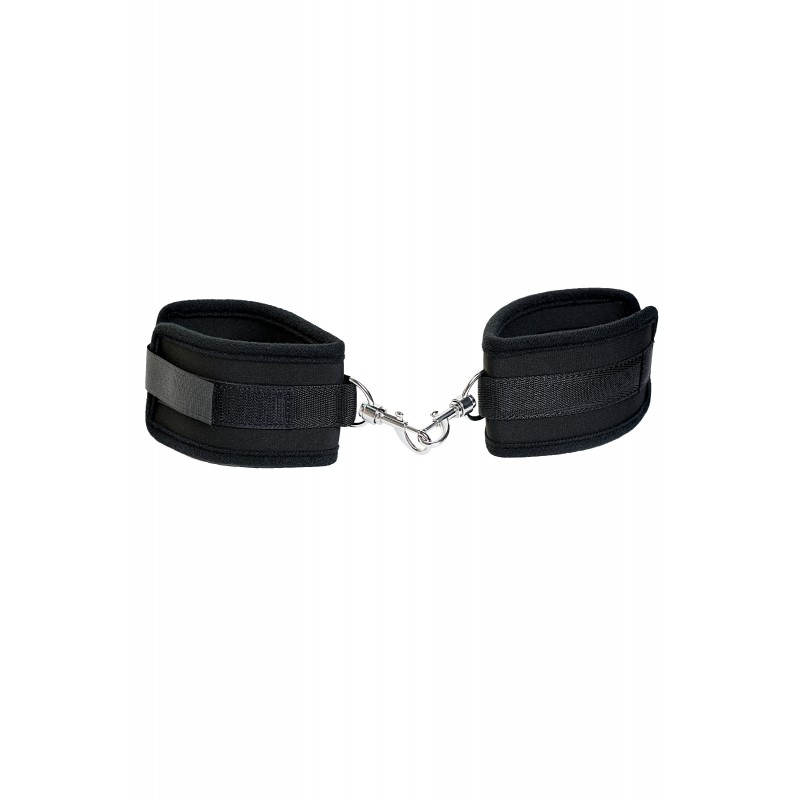 Оковы на ноги черные неопреновые. Мягкие оковы с застежкой велкро, позволяющей максимально регулировать объем. Между собой манжеты соединены карабинами. сцепка 10 см