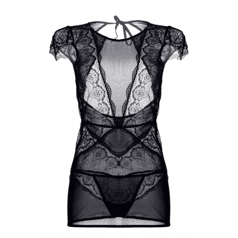 Платье Candy Girl® Estelle из эластичной сетки с шикарным рельефным кружевом, открытой спиной и миниатюрными рукавами украшено россыпью серебристых страз в зоне декольте. Продуманный дизайн визуально формирует приталенный силуэт. Завязки на шее сзади позволяют снять наряд в считанные мгновения. Т-стринги в комплекте.