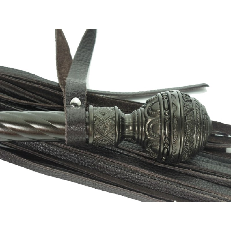 Плеть выполнена из натуральной кожи коричневого цвета. Витая рукоятка длиной 16 см и диаметром 2,5 см сделана из металла, сверху декорирована рельефным шаром диаметром 5 см.