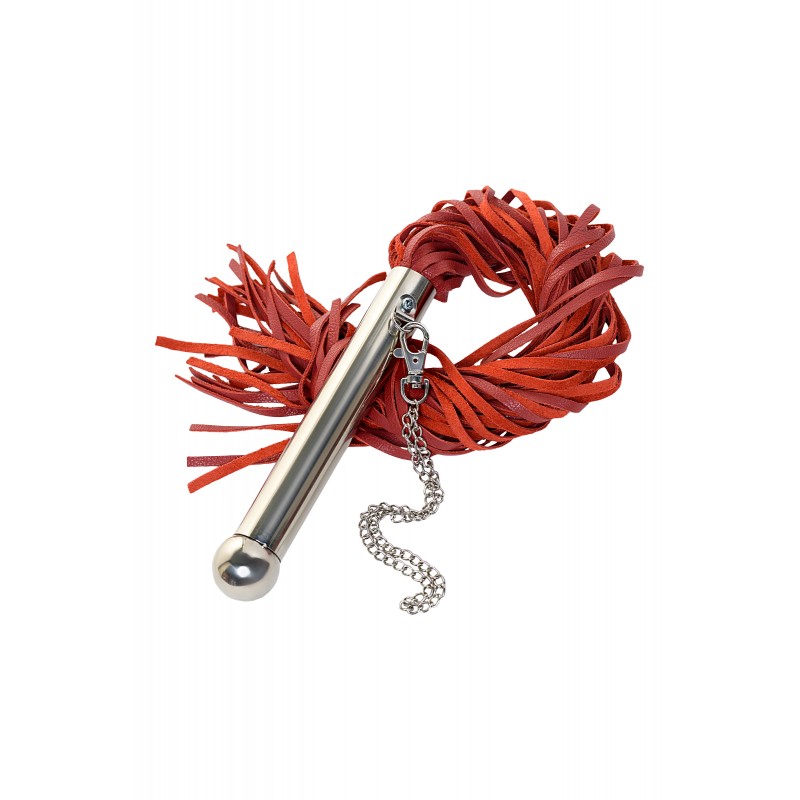 Натуральная красная кожа и металлическая рукоятка — стильная классика жанра. Рукоятка 18 см с петлёй-цепочкой делает использование максимально удобным. И хоть предназначена плеть для средних и сильных воздействий по разогретому телу партнёра, лёгкие удары мягкой кожей также подарят непередаваемые ощущения.