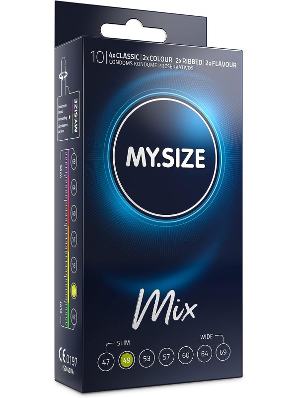 My.Size Mix – презервативы, идеальные по размеру с расширенной размерной линейкой, которые сочетают в себе разные ощущения, но всегда Вашего размера!Все, что Вам нужно сделать, это выбрать свой размер, и Вам предлагается ряд новых ощущений! Коробка содержит только один размер для Вашего комфорта, а содержимое упаковки предлагает сочетание классических, ребристых, цветных и ароматизированных презервативов, в зависимости от Вашего настроения или предпочтений.