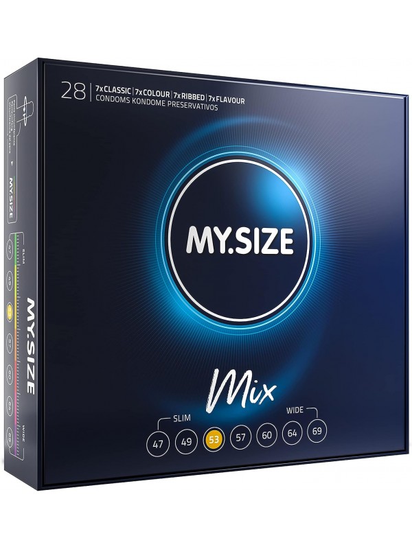 My.Size Mix – презервативы, идеальные по размеру с расширенной размерной линейкой, которые сочетают в себе разные ощущения, но всегда Вашего размера!Все, что Вам нужно сделать, это выбрать свой размер, и Вам предлагается ряд новых ощущений! Коробка содержит только один размер для Вашего комфорта, а содержимое упаковки предлагает сочетание классических, ребристых, цветных и ароматизированных презервативов, в зависимости от Вашего настроения или предпочтений.