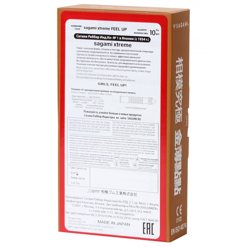 Sagami Xtreme FEEL UP - продукт, разработанный на основе пожеланий женской аудитории! Особенность этой модели - увеличение дополнительного напряжения в наиболее чувствительных областях у мужчины, что приводит к усилению активности обоих партнеров.В упаковке 10 шт.Длина 190 + /- 10 мм, ширина 58+/- 2 мм
